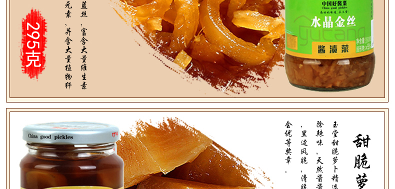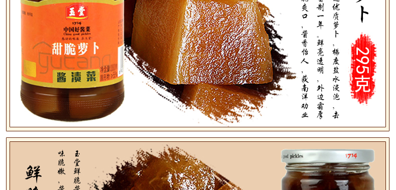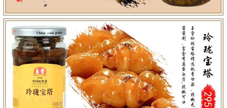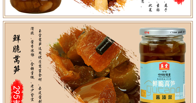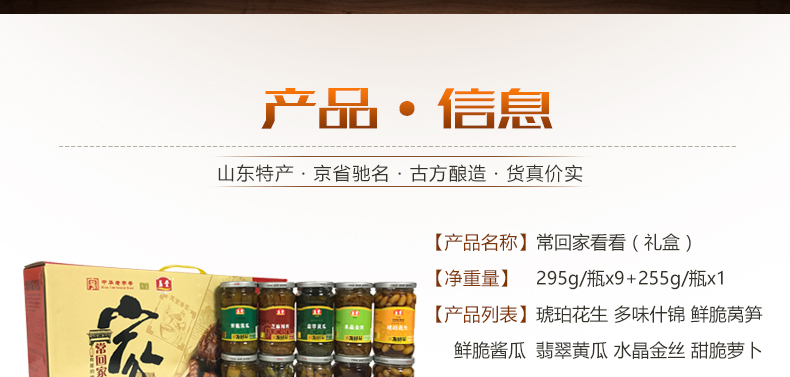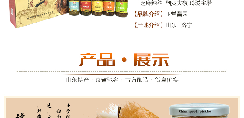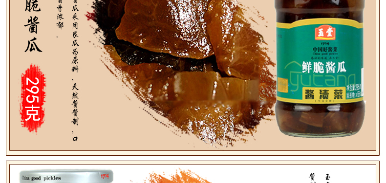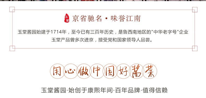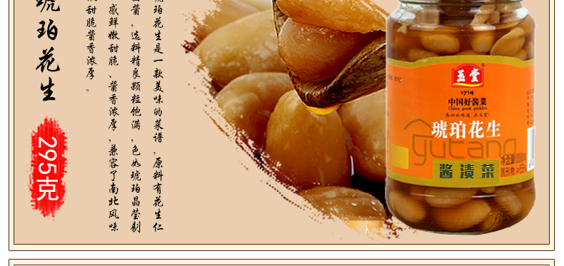 常回家看看 外观杏黄色、色如琥珀、晶莹剔透,颗粒均匀饱满、光亮、咸甜适度,酱香浓郁,脂香扑鼻,口感脆爽。 公司名称: 山东玉堂酱园有限责任公司 公司地址: 济宁市任城区济邹路1号 服务热线: 400-6900-008 QQ: 416904816 邮箱: yutang300@126.com 网址: www.yutang.com.cn