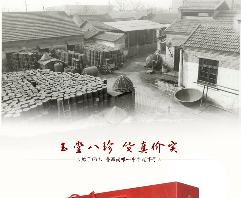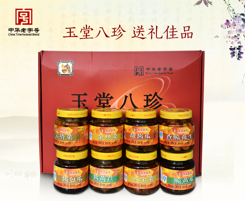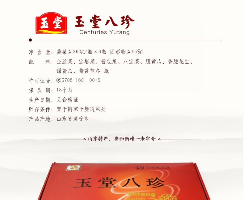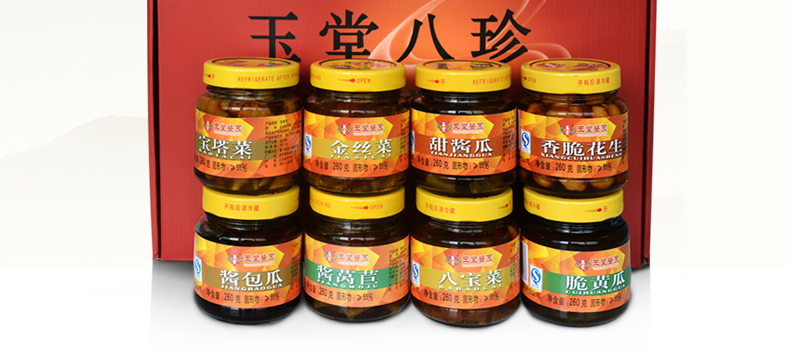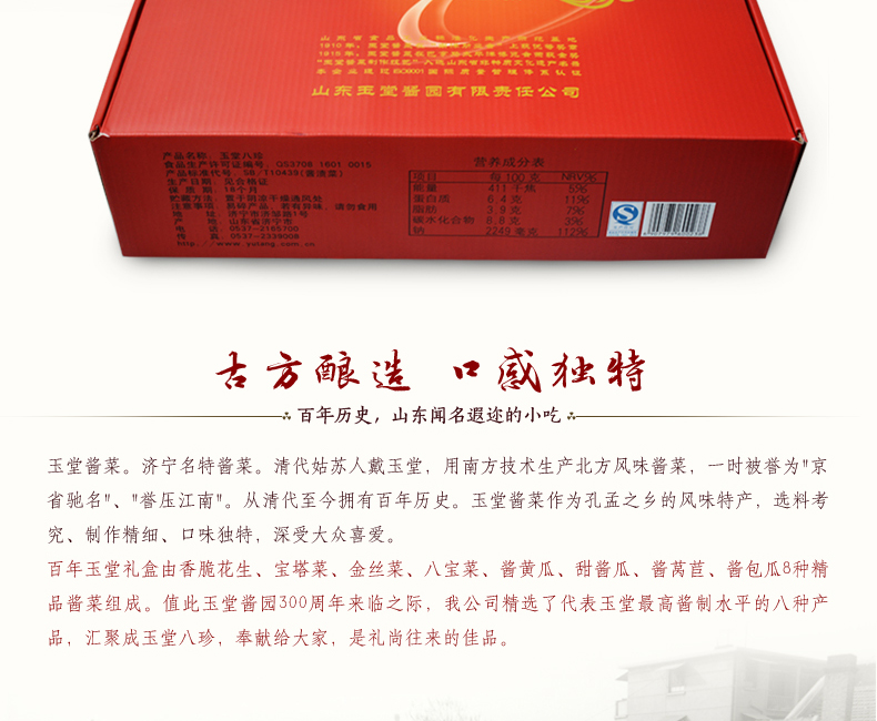 玉堂八珍 酱香浓郁、色泽鲜艳,脆而适口,色、香、味、型俱佳,南北风味兼而有之。 公司名称: 山东玉堂酱园有限责任公司 公司地址: 济宁市任城区济邹路1号 服务热线: 400-6900-008 QQ: 416904816 邮箱: yutang300@126.com 网址: www.yutang.com.cn
