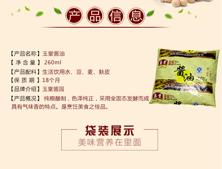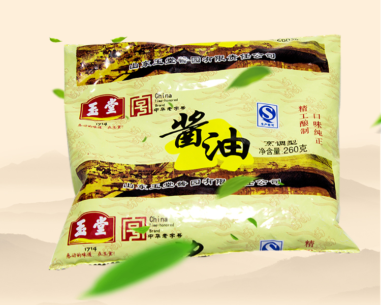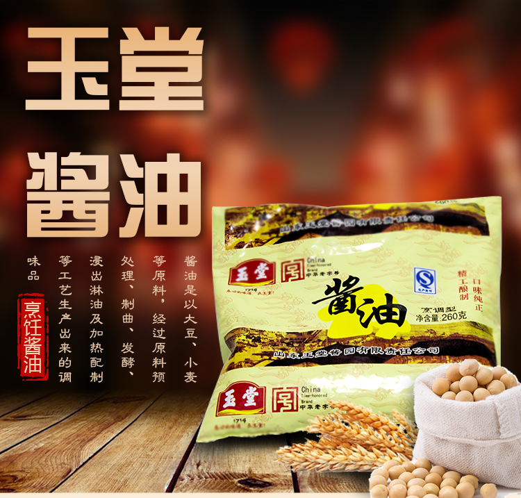 玉堂酿造酱油是以脱脂大豆、小麦和麸皮为原料采用高盐稀态工艺,后期采用增香酵母、乳酸菌强化增香酿制而成,具有特殊色、香、味的液体调味品。