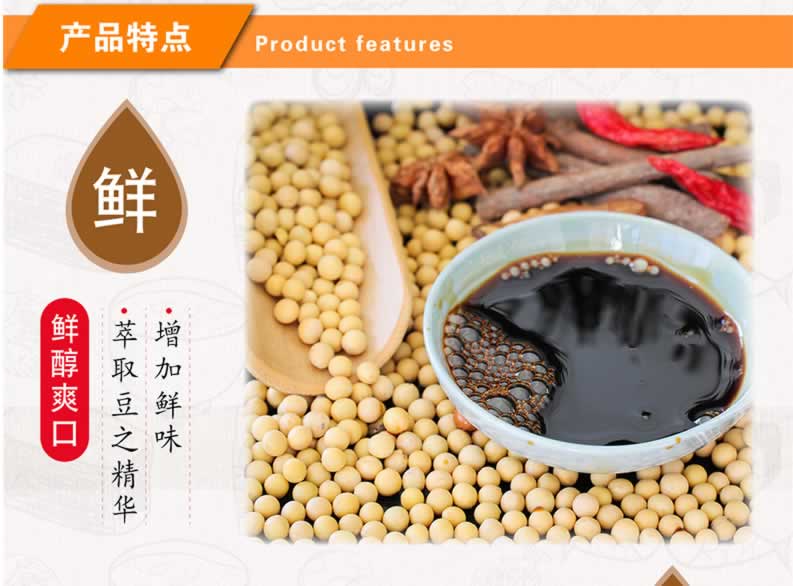 产品特色:特红老抽酱油专为宾馆、酒店、居家烹调研制,是红烧专用酱油。产品体态浓厚,色泽红亮鲜润,香醇宜口,炒、烹、炖、烧均有增色添香之奇妙功效。