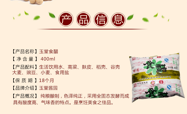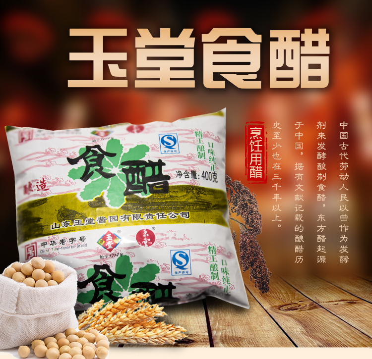 产品特色 呈棕红色或棕褐色,酸味柔和、回味绵长、酸甜适口,具有特有的香气和醋香。主要有陈醋、米醋、糯米香醋、晒醋、五粮醋、醇香醋等品种,100%纯粮酿造醋。 公司名称: 山东玉堂酱园有限责任公司 公司地址: 济宁市任城区济邹路1号 服务热线: 400-6900-008 QQ: 416904816 邮箱: yutang300@126.com 网址: www.yutang.com.cn