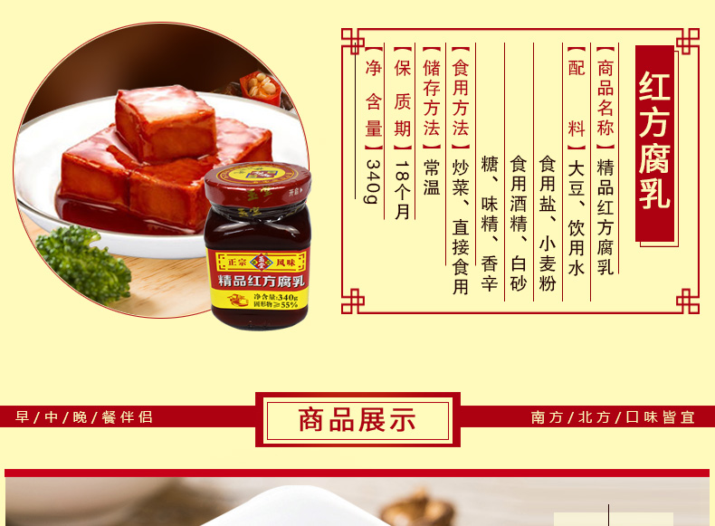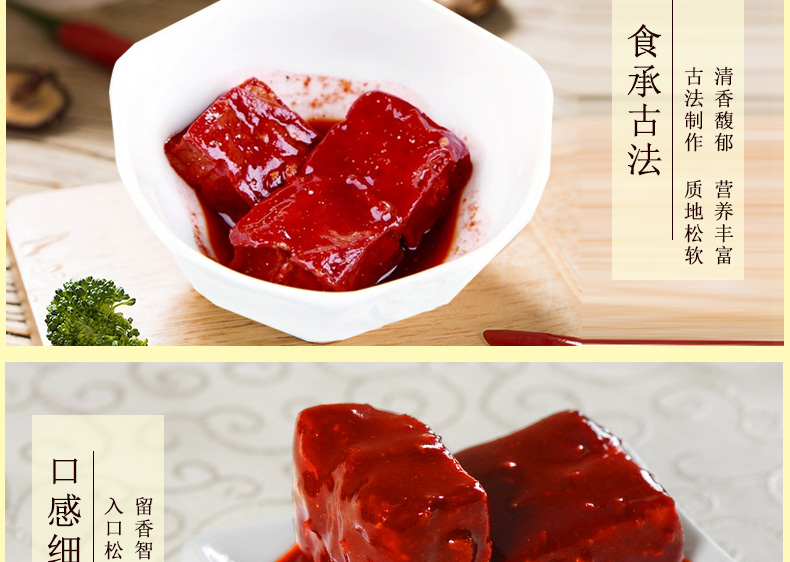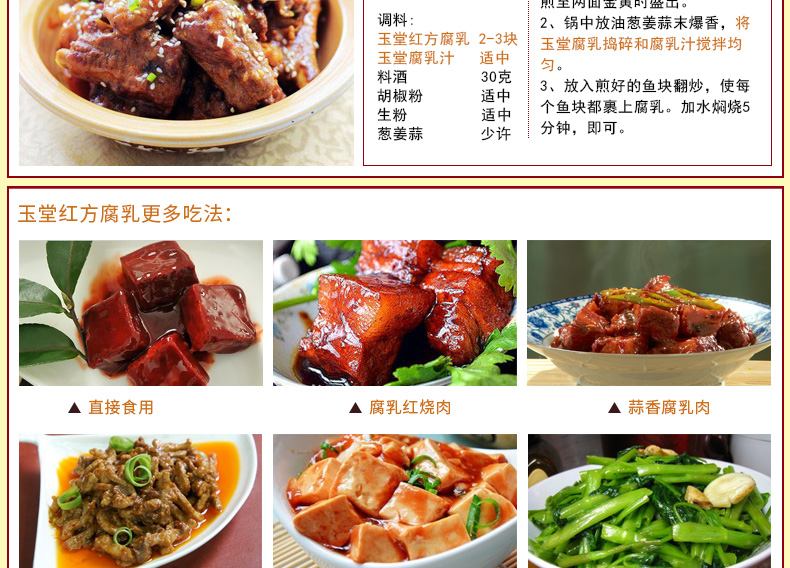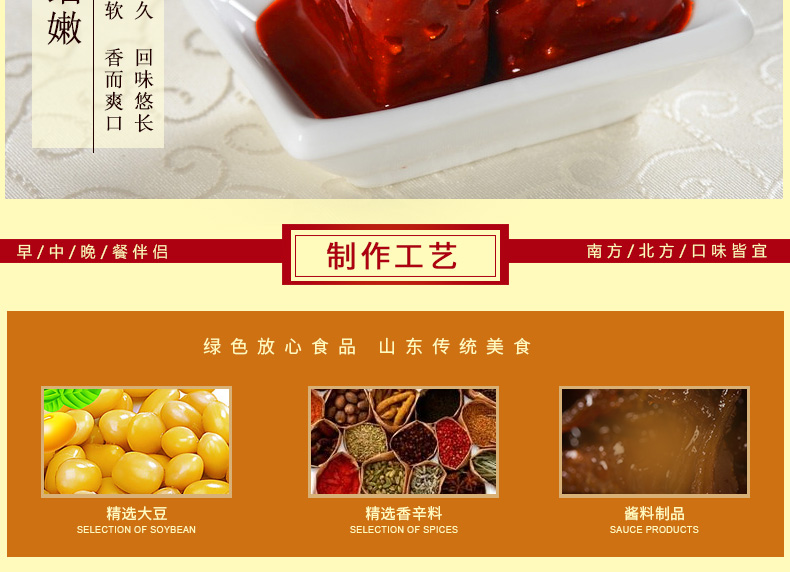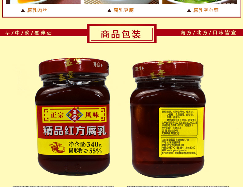 产品特色 玉堂酱园精品红方腐乳340g拌面下饭菜,火锅腐乳汁,酱豆腐毛豆腐小菜,质地细腻、营养丰富。 公司名称: 山东玉堂酱园有限责任公司 公司地址: 济宁市任城区济邹路1号 服务热线: 400-6900-008 QQ: 416904816 邮箱: yutang300@126.com 网址: www.yutang.com.cn