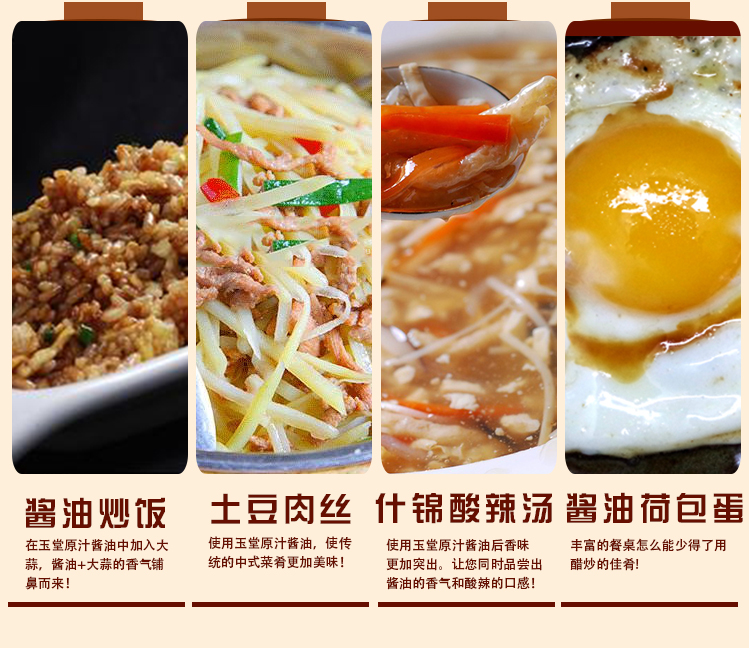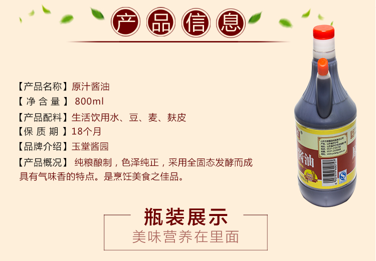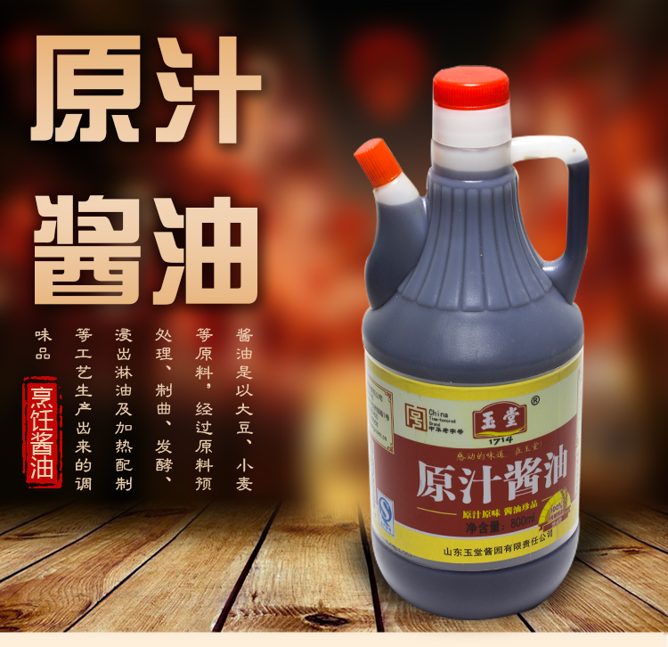 产品特色 玉堂原汁酱油产品深红褐色,酱香浓郁,味鲜醇厚、体态浓稠,原汁原味,不添加酱色。适合烹调各类菜肴或蘸食特别适合调制饺子馅用。 公司名称: 山东玉堂酱园有限责任公司 公司地址: 济宁市任城区济邹路1号 服务热线: 400-6900-008 QQ: 416904816 邮箱: yutang300@126.com 网址: www.yutang.com.cn